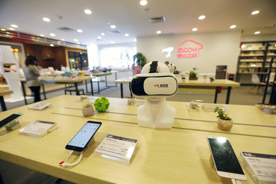 ▲在京东之家,顾客可以现货购买,线上线下同价。店员告诉记者,如果当天有款单品在线上做优惠活动,低于正常零售价,那么在线下也能以活动价购买到该产品。