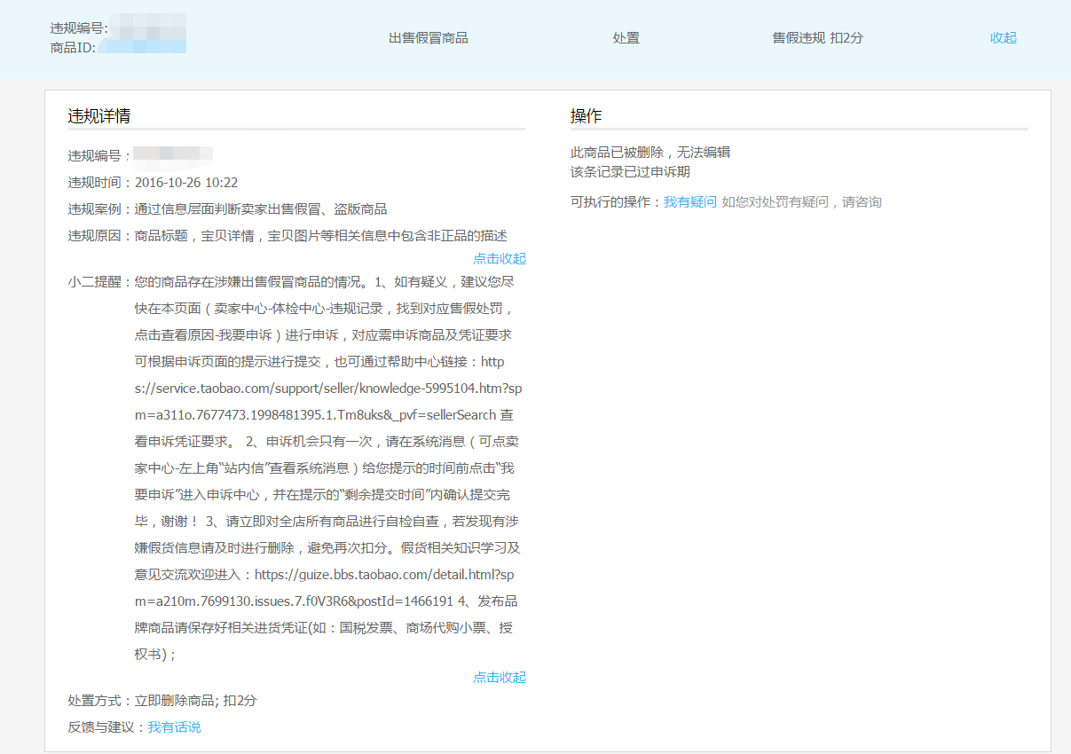 PS: 若找不到申诉入口,请确认申诉是否已经超时(商品处罚的5天内可进行申诉),且申诉只有一次机会,若已经申诉过了,则无法再次申诉。
